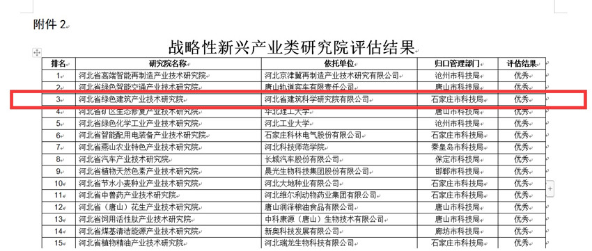 2023年2月9日,河北省科技廳發布了關于2022年度省級產業技術研究院績效評估結果的公示。經評估,我公司建設運行的“河北省綠色建筑產業技術研究院”榮獲戰略性新興產業類研究院優秀等次。