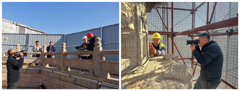 2023年12月8日,趙州陀羅尼經幢保護工程施工現場,我公司技術人員攻堅克難、不畏嚴寒,依然奮斗在施工崗位。在新搭設的腳手架上,他們牢記文物保護方針,采用科學、合理的技術手段對石質文物表層結殼、結膜污染進行清理,并依照方案核對塔身各類殘損病害,為后期的修繕工作做足準備。