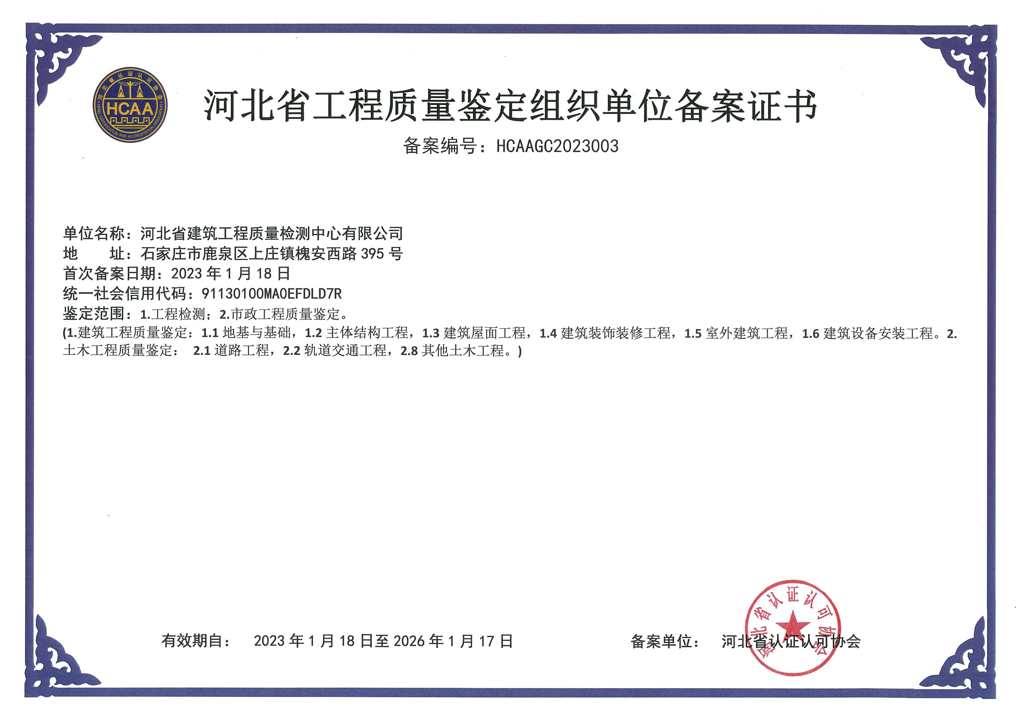 河北省建筑工程質(zhì)量檢測中心認證證書2